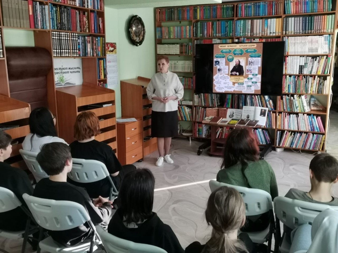 Ребята погрузились в удивительный мир сатиры и мудрости, который создал этот гениальный мастер слова. Дети с интересом узнали о непростой, но такой богатой биографии Салтыкова-Щедрина. Библиотекарь Цырульникова Т. И. рассказала о его детстве, о годах учёбы, о службе, давшей ему столько материала для его острых произведений, и, конечно же, о том, как он стал тем самым «писателем мудрых сказок», чьи произведения до сих пор заставляют нас смеяться и задумываться.