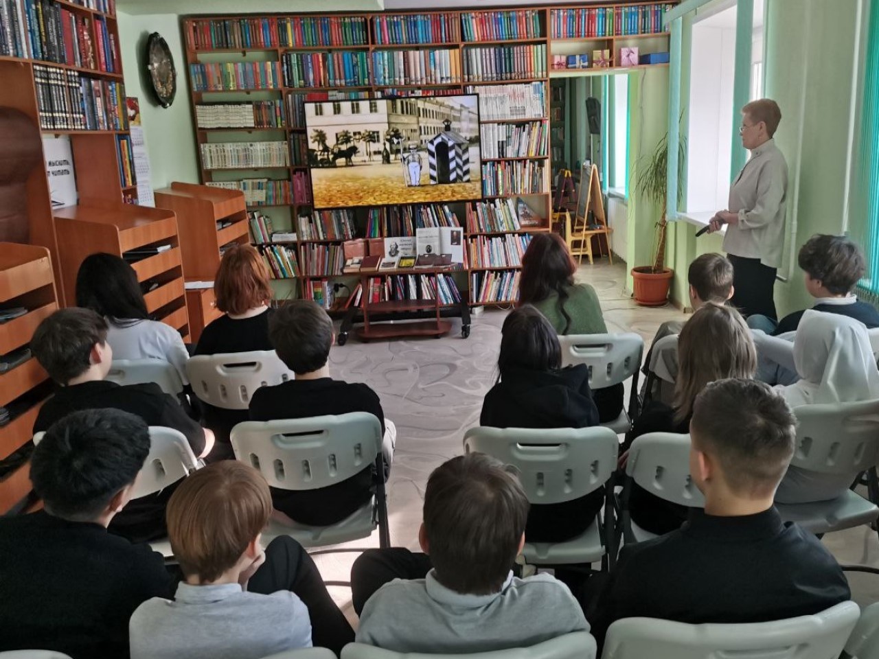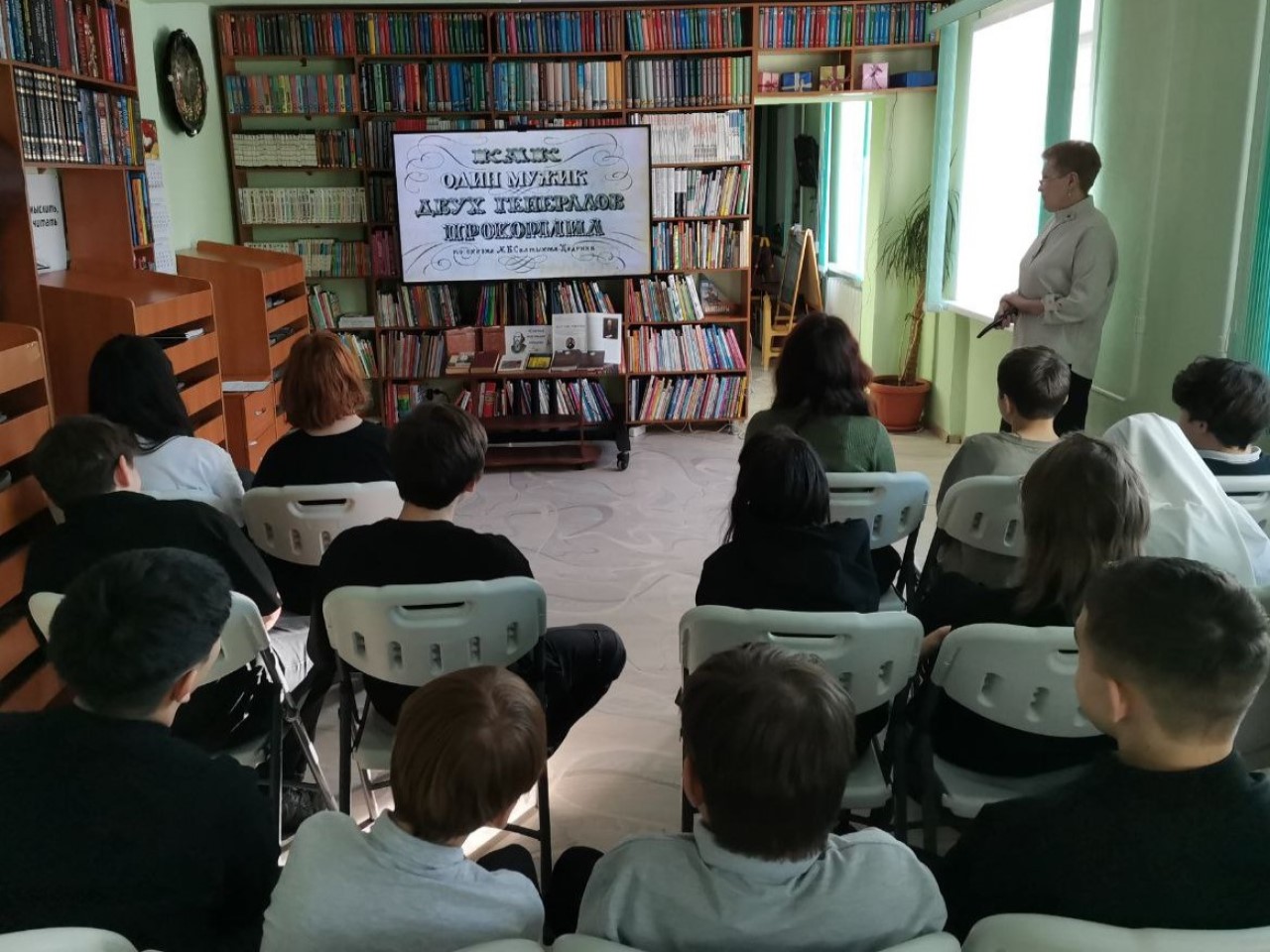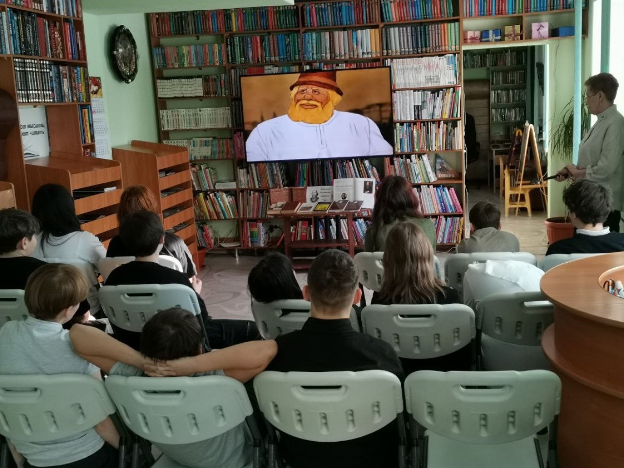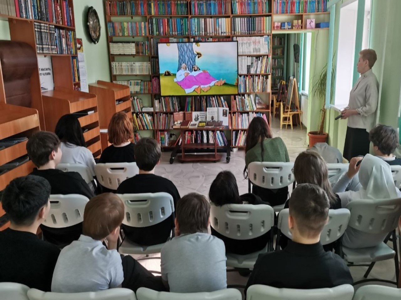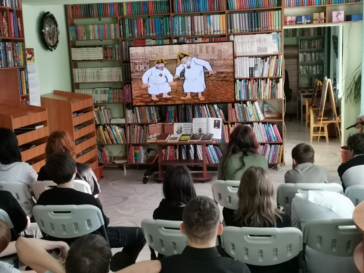 Библиотекарь предложила ребятам посмотреть мультипликационный фильм по сказке «Как один мужик двух генералов прокормил». После просмотра учащиеся ответили на вопросы викторины по этой сказке и обсудили сюжет, героев, какую главную мысль хотел передать автор.